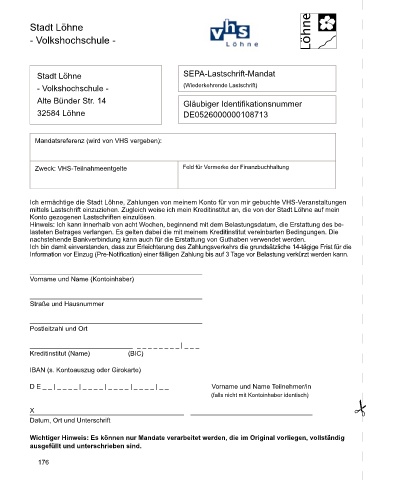 Ich ermächtige die Stadt Löhne, Zahlungen von meinem Konto für von mir gebuchte VHS-Veranstaltungen